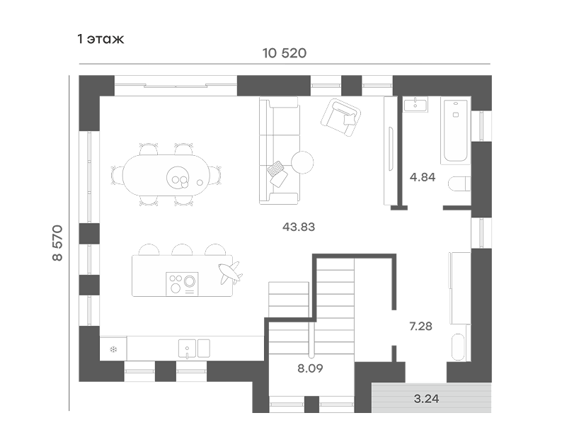 Кухня-гостиная 36 м² с выходом на террасу.