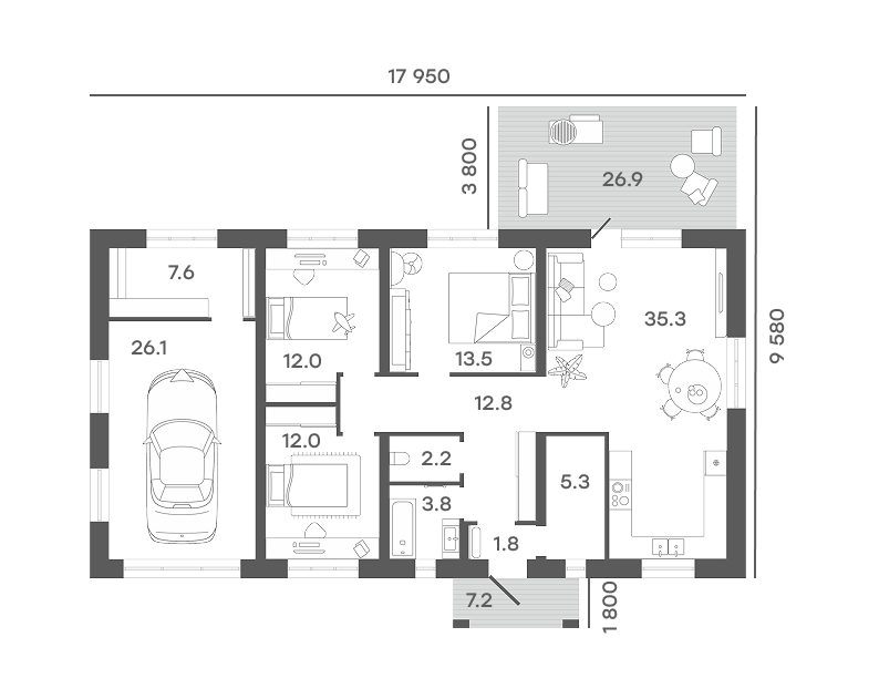 Кухня-гостиная 21,7 м² с выходом на террасу.