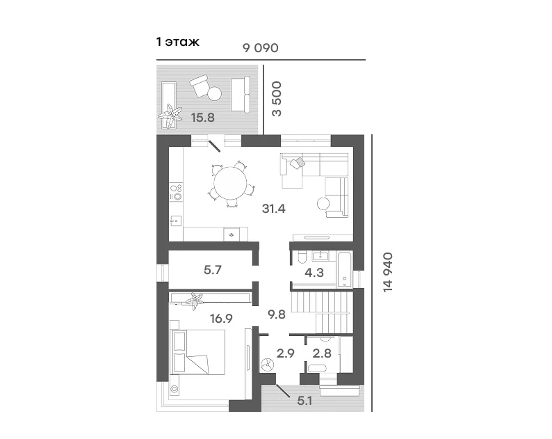 Кухня-гостиная 31,4 м² с выходом на террасу.