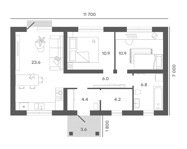 Кухня-гостиная 23,6 м² с выходом на задний двор.
